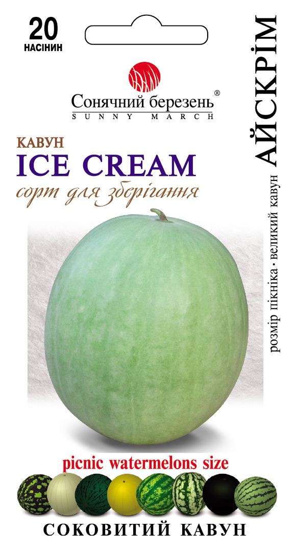 Старовинний сорт, один з різновидів Ice Cream - Морозиво (є сорти з білою м'якоттю), він був дуже популярний у XIX столітті в США, як кавун для пікніка через його особливу насолоду та середній розмір. В даний час Ice Cream вирощується як кавун для зберігання. Плід круглий, зі світлою шкірою кольору слонової кістки, вагою близько 10 фунтів (5 кг). М'якоть яскраво-червона, щільна і хрумка, насіння чорне. Якщо ці кавуни зберігаються в прохолодній, сухій коморі, то можлива безпека протягом усієї зими.
