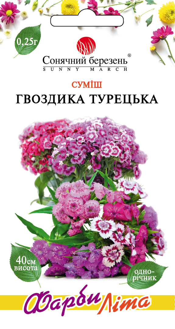 Суміш однорічних сортів, вигідною особливістю на відміну від дворічних, є те, що цвіте в той же сезон і не потрібно чекати цілий рік, щоб помилуватися цими різнобарвними букетами. Рослина висотою 35-40 см з великими суцвіттями діаметром до 10 см. Суцвіття складаються з маленьких махрових квіток різних кольорів: білі, бузкові, рожеві, малинові та бордові. Ця суміш відрізняється не тільки чудовим поєднанням забарвлень, а й ніжним тонким ароматом. Турецька гвоздика широко використовується для створення клумб, змішаних квітників і на зріз в букети.