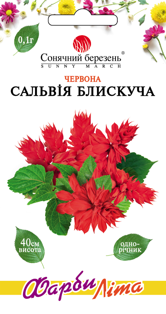 Однорічна, компактна рослина висотою близько 40 см, дуже приваблива завдяки насичено-червоним прицвітним листам, зібраним у довгі (20-25 см) прості суцвіття. Сальвія декоративна вже за місяць після посіву. Цвіте із середини червня до пізньої осені, зберігаючи свою декоративність. Віддає перевагу сонячним місцям і грунтам без надлишку органічних добрив. Посів проводять у березні-початку квітня розсадні ящики на глибину 0,5-0,8 см. Сходи з'являються через 7-14 днів, після чого саджанці пікірують. У ґрунт розсаду висаджують, коли мине загроза весняних заморозків. Відстань між рослинами 30-35 см. Сорт цікавий для створення пейзажних композицій, монокультурних клумб та міксбордерів.