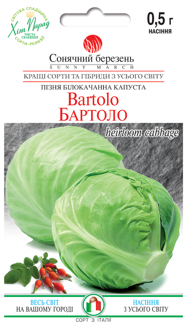 Надійний пізньостиглий сорт, створений для тих, хто цінує великі качани, відмінний смак і тривале зберігання. Це справжня «зимова» капуста, яка формує потужний урожай наприкінці сезону і зберігає якість до самої весни. Сорт дозріває через 140-160 днів після появи сходів. Особливої цінності набуває після перших заморозків, коли смак стає ще солодшим і насиченішим. Водночас за збирання до морозів качани краще зберігаються, що робить Бартоло універсальним для різних стратегій вирощування. Рослина формує високу листкову розетку. Листя велике, пухирчасте, сіро-зелене, з густим восковим нальотом і хвилястим краєм, що забезпечує гарний захист качана. Качани великі, щільні, соковиті, округлі або плоско-округлі, масою 3-4,5 кг, а за сприятливих умов до 5-7 кг. На розрізі мають привабливе жовте забарвлення. Сорт відзначається високою товарністю до 93%, вирівняними качанами та відмінними смаковими якостями. Бартоло ідеально підходить для квашення, зимових заготовок і тривалого зберігання. Качани зберігають соковитість і щільність до червня, не втрачаючи смаку. Це капуста для тих, хто планує врожай наперед і хоче мати якісний продукт на всю зиму.