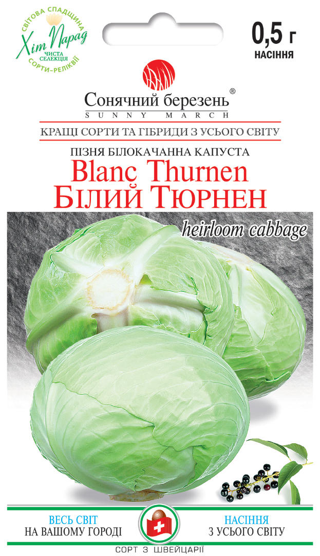 Класичний пізньостиглий сорт, створений спеціально для тривалого зберігання. Це капуста для тих, хто хоче мати якісний урожай не лише восени, а й навесні та на початку літа. Сорт дозріває через 160-170 днів після появи сходів, а після висадки розсади у ґрунт урожай готовий через 120-130 днів. Рослина формує підняту листкову розетку з міцним, добре захищеним качаном. Листя сіро-зелене, із сильним восковим нальотом, що підвищує стійкість до зовнішніх факторів і зберігання. Качани вирівняні, добре вкриті листям, округлі, злегка сплющені, масою 3-4 кг. На розрізі мають яскраво-білу, соковиту серцевину. Важлива перевага сорту стабільність у полі: при дозріванні качани не завалюються на бік і довго зберігають товарний вигляд прямо на корені. Білий Тюрнен є одним із кращих сортів для зимового зберігання. Качани зберігаються 7 місяців і більше, за належних умов легко долежують до липня, не втрачаючи щільності та соковитості.