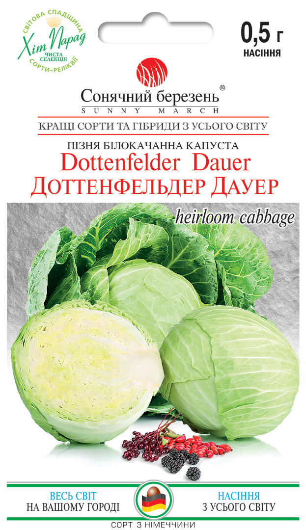 Новий сорт великої, твердої пізньостиглої білокачанної капусти голландського білого типу, яка добре зберігається. Цей енергійний та продуктивний сорт особливо вражає завдяки своєму тонкому та солодкому смаку. Дозріває через 120 днів від висадки розсади. Виведений німецьким селекціонером Дітером Бауером як альтернатива гібридної капусти. Листова розетка середнього розміру, компактна, піднята. Листя широкоовальної форми, темно-сіро-зеленого забарвлення із сильним восковим нальотом. Качани з деякою природною різноманітною формою - від округлої, овальної і до плоскої - це свідчить про різноманітний генофонд. Вони дуже щільні, середньою вагою 3-4 кг (максимум 8 кг). Внутрішня кочерига коротка. Структура качана ніжна та тонка, забарвлення чисто-біле. Зберігається як мінімум до квітня, набираючи соковитості та чудового смаку. Універсального використання, хороша для квашення, але також відмінно підійде для споживання у свіжому вигляді та приготування кулінарних шедеврів (особливо смачними та ніжними виходять голубці).