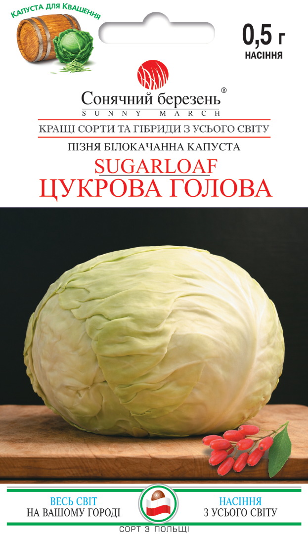 Пізньостиглий високоякісний сорт із великими, вирівняними качанами масою 3-3,5 кг. Формує потужну розлогу розетку та дуже щільні округлі головки з білосніжною, соковитою й хрумкою м’якоттю. Смак виразно солодкий, без гіркоти, що робить цю капусту особливо цінною для свіжого споживання та квашення. Завдяки щільній структурі й високому вмісту природних цукрів качани добре зберігають соковитість і хрумкість протягом зими, зберігаючись до весни. Сорт відзначається стабільною врожайністю та стійкістю до основних хвороб капусти (кіла, фузаріоз, бактеріози). Дозріває через 140-150 днів, придатний для тривалого зберігання, засолювання та класичного квашення. Справжня солодка зимова капуста з щільною текстурою та чистим смаком.