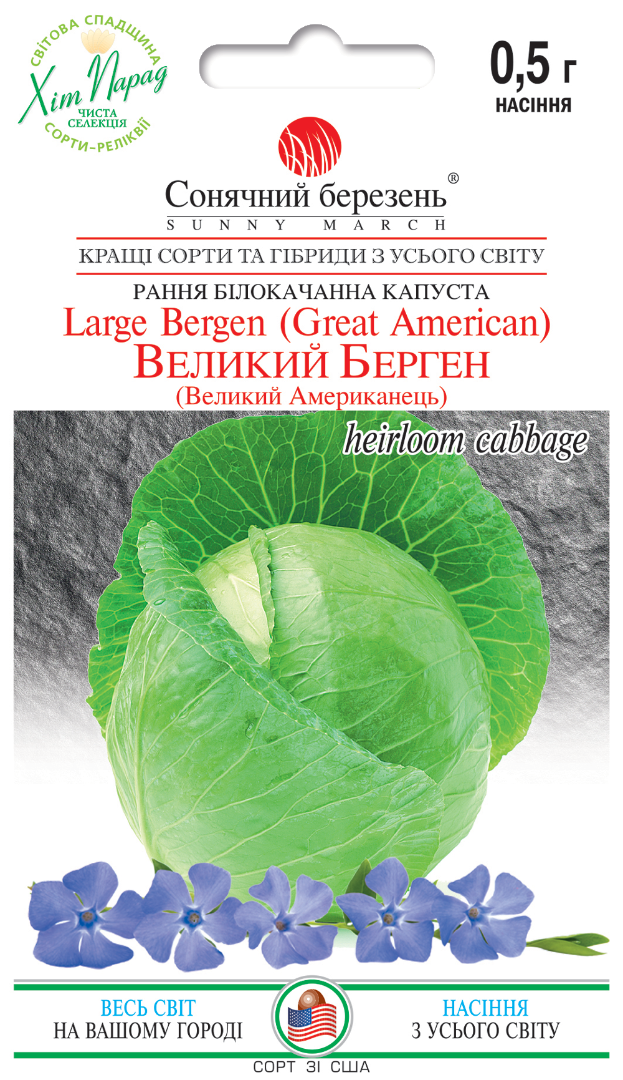 Великий Берген, відомий також як Великий Американець, старовинний сорт, перевірений десятиліттями вирощування. Його створено на основі класичних високоякісних німецьких ліній, що забезпечило поєднання стабільності, смаку та витривалості. Сорт ранньостиглий: від появи сходів до технічної стиглості минає 100-110 днів, а після висадки розсади качани дозрівають уже через близько 60 днів. Це дозволяє отримувати ранній, дружний і вирівняний урожай. Рослина формує компактну, підняту розетку діаметром 40-60 см. Листя гладке, округле, ніжно-зелене з легким восковим нальотом і акуратним хвилястим краєм. Качани щільні, округлі, добре вирівняні, масою 1-2 кг, з короткою внутрішньою кочеригой і привабливою білою серцевиною. Сорт вирізняється дуже високою товарністю до 98% врожаю має ідеальний вигляд. Дозрівання дружне, що зручно для одночасного збирання. Великий Берген особливо цінується у свіжому вигляді завдяки ніжному листю та чистому, приємному смаку. Сорт стійкий до посухи та знижених температур, що робить його надійним вибором для різних умов вирощування.