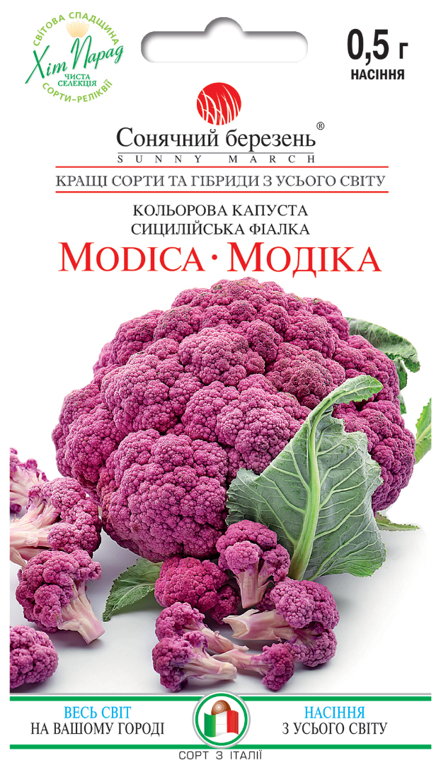 Модіка автентичний сицилійський сорт фіолетової цвітної капусти, який особливо високо цінується в регіоні Рагуза. Це не просто овоч, а частина кулінарної культури Сицилії, де цей сорт вважають еталонним за смаком і якістю. Рослина формує велику, щільну, дуже однорідну головку насиченого темно-фіолетового кольору. Суцвіття компактне, важке, з бездоганною структурою. Сорт основного сезону, збір урожаю проводять через 110-130 днів після висадки розсади. Потужне листове покриття надійно захищає ніжне суцвіття від палючого сицилійського сонця, зберігаючи його соковитість, колір і тонку текстуру. Саме ця природна «парасоля» забезпечує високу якість головок навіть у спекотному кліматі. Головна цінність сорту унікальний смак, який відрізняє Модіку від звичайних цвітних капуст. Він м’який, глибокий, з легкими горіхово-солодкими нотами, особливо виразний після теплової обробки. У Сицилії Модіку традиційно використовують у класичних стравах Bastaddi affucati (відварена цвітна капуста) та фокаччі з фіолетової капусти. Сорт вважається найкращим для приготування на пару, де повністю розкривається його текстура і аромат.
