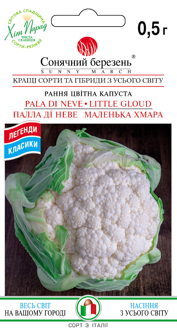 Ранній сорт порційної цвітної міні капусти. Від висаджування розсади до першого збору близько 50 днів. Розетка листя вертикальна, компактно зібрана. Листя невелике, вузьке, світло-зелене. Головка кругла, повністю укрита, щільна, чисто білого кольору масою 0,5-1 кг, залежно від термінів збору. Сорт швидкозростаючий, відрізняється дружнім зав'язуванням та дозріванням суцвіть в умовах спекотного літа і чудово росте у ранньо-весняний та осінній періоди. Може бути вирощений, як дитяча цвітна капуста або залишений рости до повнорозмірних голів.