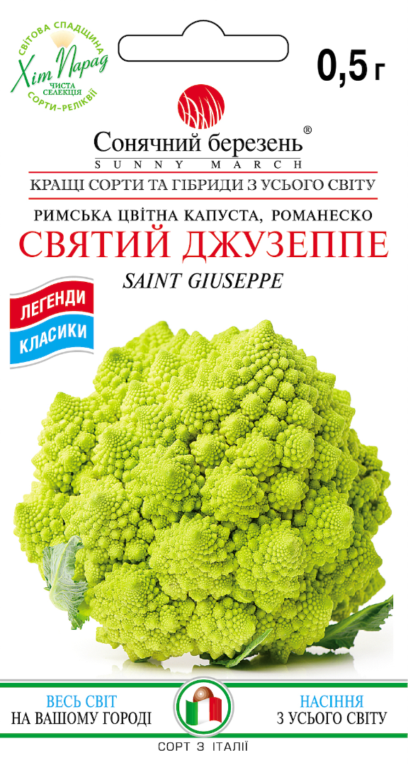 Це найкрасивіший овоч-справжній «Objet d'art» - неоново-зеленого кольору та неземною головою, покритою шипами у вигляді логарифмічних спіралей. Старовинний італійський сорт XV століття, який був наново відкритий. Це більше, ніж цвітна капуста та броколі. Потужна рослина з красивим великим суцвіттям вагою 1,5-1,7 кг, що є щитком, що складається з безлічі маленьких конусів з неймовірними завитками, які повторюють загальний вигляд голови. Романеско ніжніша за текстурою і має м'який вершково-горіховий солодкий смак, без гіркуватої нотки, властивою цвітній капусті, вона подобається дітям, саме з цієї причини San Giuseppe чудова, приготовлена на пару, грилі, бланширована або просто сира в салаті. Вирощують для дитячих голів, щоб з'їсти повністю або до повного розміру, висаджуючи за схемою 50x70-90 см. Після того, як основна голова прибрана, відростатимуть невеликі голівки протягом наступних кількох тижнів.