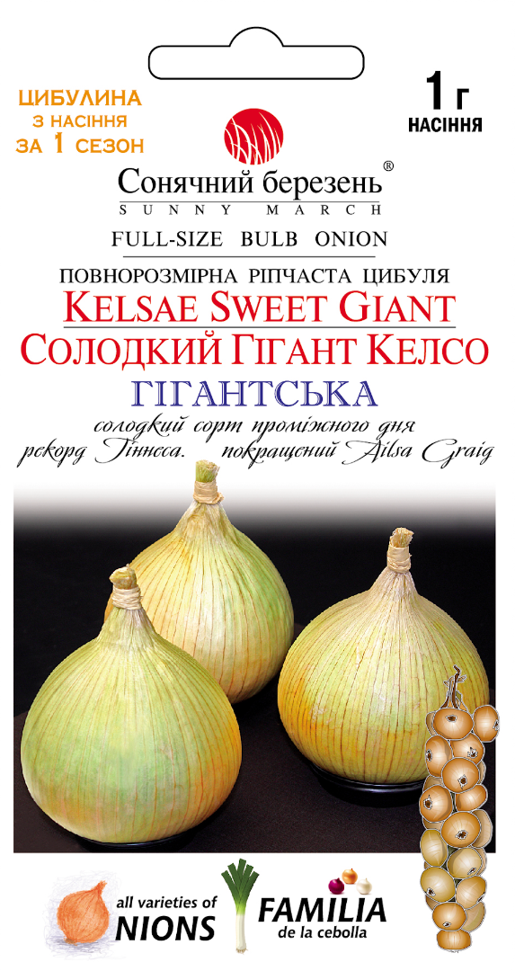 Солодкий гігантський лук Kelsoe є світовим рекордом Гіннеса за величиною найбільшої цибулі у світі, його вага становить 15 фунтів 5,5 унцій і діаметр 33 дюйми! Зробіть враження на ваших сусідів і спробуйте виростити цибулю розміром зі світовий рекорд. Цей сорт сімейної реліквії з'явився в Шотландії в 1950-х роках внаслідок багаторічних відборів із старовинної цибулі Ailsa Craig (1887). Сорт довгого дня, що добре росте у північних регіонах (100 днів від висадки розсади). В умовах України набирає ваги близько 1 кг. Це класична, високоякісна м'яка цибуля з розміром від гігантської до колосальної. Цибулини округлі до краплевидних із солом'яно-жовтою шкірою. Тверда, з м'якою солодкою м'якоттю та насиченим ароматом, цибуля тонкої текстури, відмінно підходить для салатів, бутербродів та заморозки. Має досить добрий потенціал короткочасного зберігання.