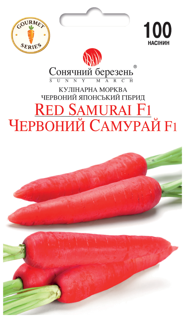Унікальна японська морква сортотипу Кінтокі, яку традиційно подають на Новий рік, вирізаючи у формі квітів сакури як символ добробуту та родючості. Це не просто коренеплід, а справжній елемент східної кулінарної культури. Морква має ефектну кавуново-червону шкірку та солодку рожево-червону м’якоть, яка зберігає насичений колір навіть після приготування. Смак значно солодший, ніж у класичних помаранчевих сортів, завдяки підвищеному вмісту цукрів і лікопіну - цінного антиоксиданту, що відповідає за інтенсивне забарвлення. Текстура шовковиста, ніжна, з яскраво вираженими карамельними нотами після теплової обробки. Стрункі коренеплоди виростають до 25-30 см у довжину, залишаючись рівними та привабливими. Гібрид ідеально підходить для пізньолітніх та осінніх посівів, а також для зимового зберігання. При збиранні наприкінці осені його колір стає ще глибшим і насиченішим. Сіють Червоний Самурай F1 від початку до кінця літа, оскільки за раннього висіву він розвивається слабше. Період дозрівання становить близько 100 днів. У кулінарії ця морква розкривається особливо яскраво: у салатах, приготовлена на пару або обсмажена у маслі, де карамельний смак стає ще насиченішим.