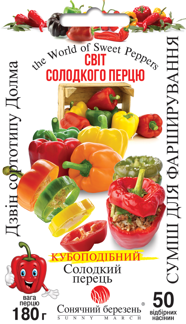 Добірна суміш класичних солодких перців сортотипу Dolma — великих блочних плодів у формі широкого дзвону, створених природою для ідеального фарширування. Це традиційні сорти без найменшої гостроти чилі, з м’ясистими товстими стінками та ніжною соковитою текстурою. У суміші представлені перці різних кольорів: від зеленого в технічній стиглості до золотистого, помаранчевого, червоного, фіолетового й кремово-слонової кістки при повному достиганні. Уже при досягненні повного розміру плоди стають солодкими, хрумкими й ароматними, а в біологічній стиглості набувають ще більшої насиченості смаку та кольору. Плоди великі, вирівняні, 7-10 см у діаметрі, масою 100-250 г, із зручною порожнистою формою та товстими стінками саме ті перці, які цінують у кухнях Середземномор’я та Близького Сходу. Рослини врожайні й стабільні, формують щедрий урожай різнокольорових Dolma-перців протягом усього сезону. Суміш включає добірку з 10 традиційних сортів різних форм і відтінків — для красивого врожаю, насиченого смаку та класичних фаршированих перців.