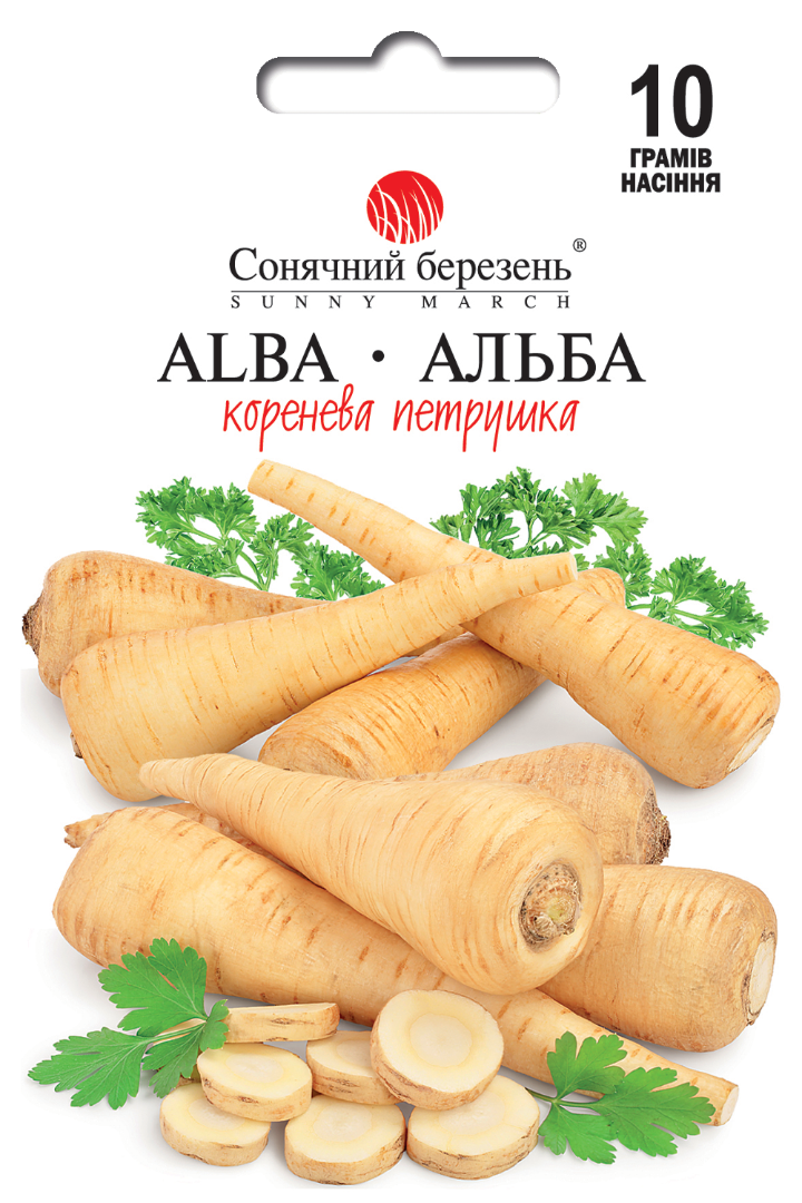 Ця петрушка схожа на ідеально сформований пастернак своїми конічними витягнутими коренеплодами білого кольору з борозенчастою текстурою, але відрізняється від нього солодким, ніжним, пряним смаком, позбавленим землістості пастернаку, скоріше схожим на моркву, приправлену селерою та петрушкою. Альба відноситься до «полудлинного» типу кореневої петрушки, який найбільш переважний у Європі. Коротке, товсте коріння довжиною близько 20 см і вагою до 150 г легше використовувати в кулінарії і вони краще ростуть на важких ґрунтах. Ця петрушка доступна цілий рік з основним сезоном у зимовий період і використовується як «супова зелень» або у сирому вигляді. Сорт славиться успішним зберіганням протягом тривалого часу, завдяки високій стійкості до гниття і чудовим смаком коренеплодів з вершковою м'якоттю, не схильною до потемніння. Коріння може бути залишено землі на всю зиму. Їх викопують за необхідності. Це петрушка подвійного призначення, з великим, плоским, їстівним, темно - зеленим листям. У вас буде перше зріле коріння всього через 3 місяці після сходів. Для раннього врожаю сіють восени чи під зиму.