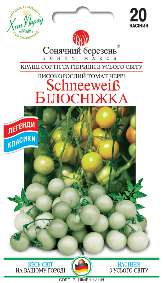 Шедевр середи чері. Дуже гарна рослина з пишними складними кистями по 20-30 плодів вражаюче виглядає вже під час цвітіння. Сорт ранньостиглий, від сходів до початку дозрівання 100-110 днів. Рослини індетермінантні, дуже високі, досягають 2-2,5 м, при формуванні в одне стебло, невибагливі та безпроблемні у вирощуванні. Плоди, досить великі чері (близько 25 г), дозрівають дружно та одночасно на кисті. Їхній колір блідо-жовтий, трохи прозорий, близький до слонової кістки (умовний білий). При повному дозріванні утворюється легкий рум'янець. Ніжні та соковиті, начебто відкалібровані, ці томати практично не містять кислоти та мають солодкий насичений смак. Їх використовують цілими або розрізаними навпіл у салатах, канапе, десертах та коктейлях. Ідеальні для консервування.