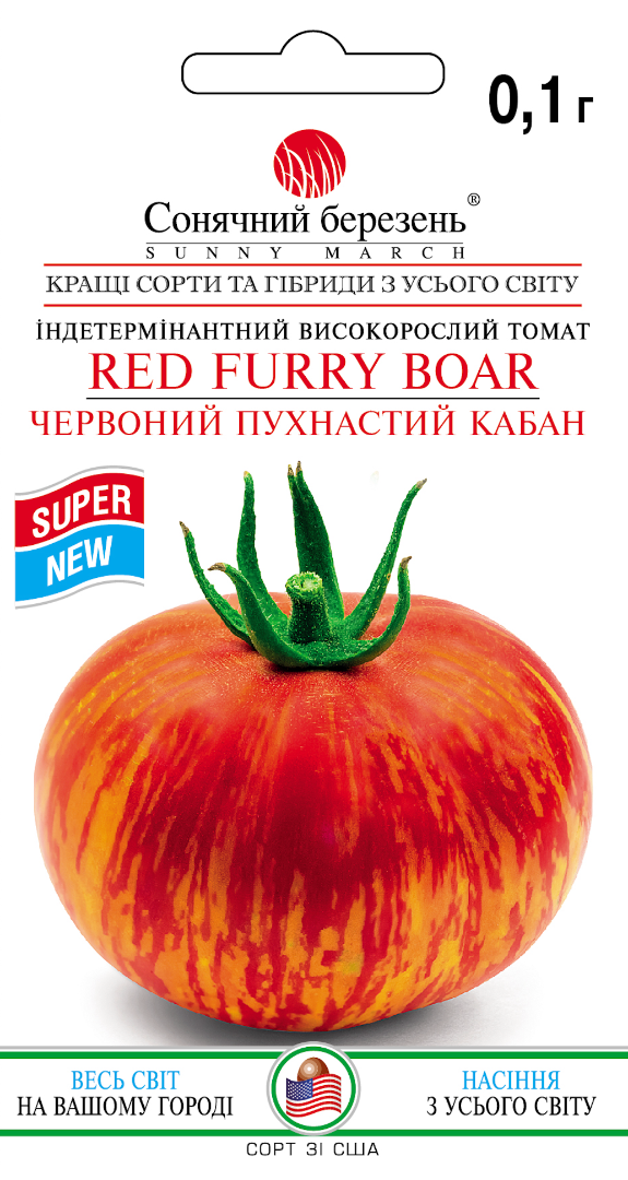 Пухнастий строкатий помідор із зовсім не нав'язливою шкірою персикового пуху. Унікальний томат для гурманів з ніжним ворсом, що утворює матовий епідерміс, розмиту оксамитову шкірку, яка не дає відблисків на сонці, у яскраво-червоній сукні, позначеній золотим полум'ям жовтих штрихів та смужок. Плоди м'які і приємні, округлої, злегка сплющеної форми, вагою від 100 до 200 г. М'якуш соковитий, кремоподібний і маслянистий, темно-червоного кольору з чудовим фруктовим ароматом і чудовим солодким смаком. Приголомшливий помідор для нарізки в салати та густого томатного соку. Добре розгалужена висока рослина (1,5-1,8 м) з густим листям, що надійно вкриває плоди від сонячних опіків. Середньостиглий сорт, що дозріває через 80 днів після пересадки, з дружньою віддачею врожаю у другій частині сезону.