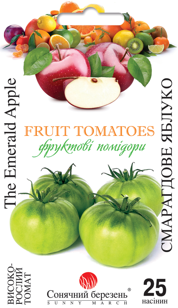 Середньостиглий (110-120 днів) сорт для плівкових теплиць та відкритого ґрунту. Рослина індетермінантна, середньоросла, висотою 1,2-1,5м. У гроні формується 3-5 плодів. Плоди плоскоокруглі, багатокамерні, у зрілому вигляді смарагдово-зелені з жовтуватим відтінком масою 250-300г, м'ясисті, соковиті, на смак дуже солодкі. Цінність сорту: рясне плодоношення, незвичайне фарбування зрілого плоду. Рекомендується для вживання у свіжому вигляді.