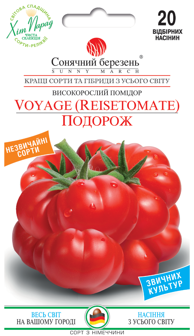 Здивуйте друзів і себе цим неймовірним німецьким реліквійним помідором. Він виглядає так, ніби велика грона черрі-помідорів зрослася в один химерний клубок, утворюючи абсолютно унікальну форму, якої ви не знайдете ні в одному сучасному сорті. Плоди легко розділяються вручну - просто відокремлюйте невеликі секції, немов часточки фрукту, не користуючись ножем. Спочатку квіти формують щільні кластери, а потім під час дозрівання плоди зливаються у величезний “гребінчастий” помідор масою від 100 до 450 г. Через свою будову цей помідор часто дозріває нерівномірно, але це тільки додає йому шарму: стиглі секції можна зірвати одразу, а менш зрілі залишити достиганути пізніше - зручно й дуже незвично. Смак - як у справжніх помідорів із дитинства: соковитий, яскраво-кислий, з глибоким томатним ароматом, який ідеально розкривається з дрібкою солі. Рослини індетермінантні, розлогі, зі звичайним листям. Висота: 1-1,5 м. Дозрівання починається приблизно через 80-85 днів після висадки розсади. Це не просто помідор - це садова пригода, емоція, реліквія та справжній “вау-ефект” на грядці і на столі.