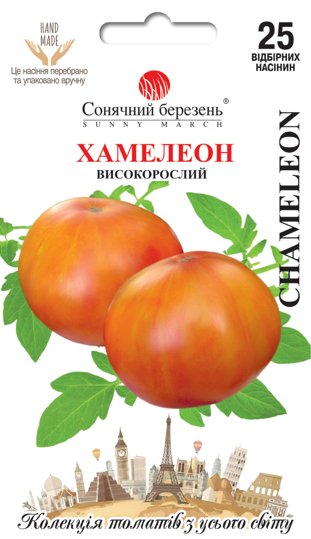Яскравий індетермінантний сорт із великими декоративними плодами, забарвлення яких змінюється в процесі достигання, створюючи справжню гру кольорів на гроні. Від світло-зелених зі смугастим малюнком томати поступово переходять у теплі оранжево-червоні тони з жовтими відтінками, залишаючись надзвичайно привабливими на всіх стадіях стиглості. Рослини потужні, заввишки близько 1,5 м, із дружною віддачею врожаю та тривалим плодоношенням до заморозків. Плоди плоско-округлі, великі, середньою масою близько 300 г, окремі до 1 кг. М’якоть соковита, м’ясиста, із солодким гармонійним смаком і тонким ароматом. Шкірка ніжна, але міцна: плоди стійкі до розтріскування, добре переносять транспортування та зберігаються тривалий час без втрати товарних якостей. Хамелеон універсальний у використанні: ідеальний для свіжих салатів, нарізок, консервування та переробки. Великі строкаті плоди особливо ефектні в салатній подачі й здатні стати справжньою окрасою столу.