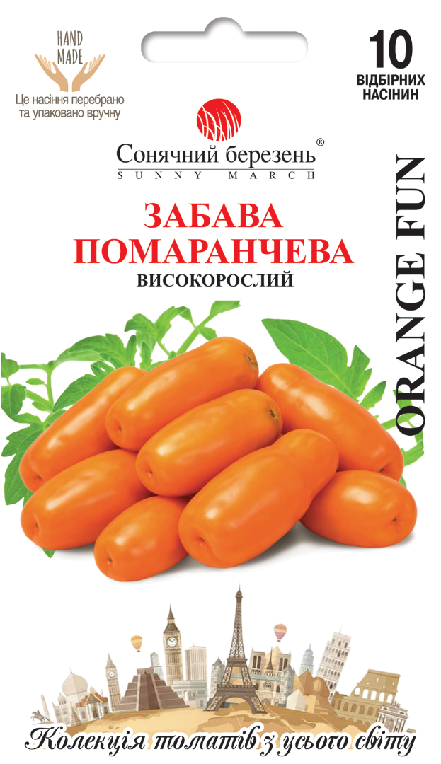 Веселий і щедрий томат із сонячним характером та впізнаваною двозубою формою плодів, ніби маленькі помаранчеві дзвіночки або свічечки. У кожній китиці ціла грона яскравих, щільних помідорів, що світяться теплим абрикосово-помаранчевим кольором і виглядають особливо ефектно в банках та стравах. Рослина потужна, високоросла (до 1,8 м), рясно зав’язує плоди по 5-10 у китиці. Томати масою до 150 г, м’ясисті, щільні, не розтріскуються, чудово зберігають форму при консервуванні й в’яленні. Смак насичений, гармонійний, із легкою солодкістю. Сорт дуже врожайний і надійний у теплицях та відкритому ґрунті з підв’язкою. Термін дозрівання: 110-115 днів.