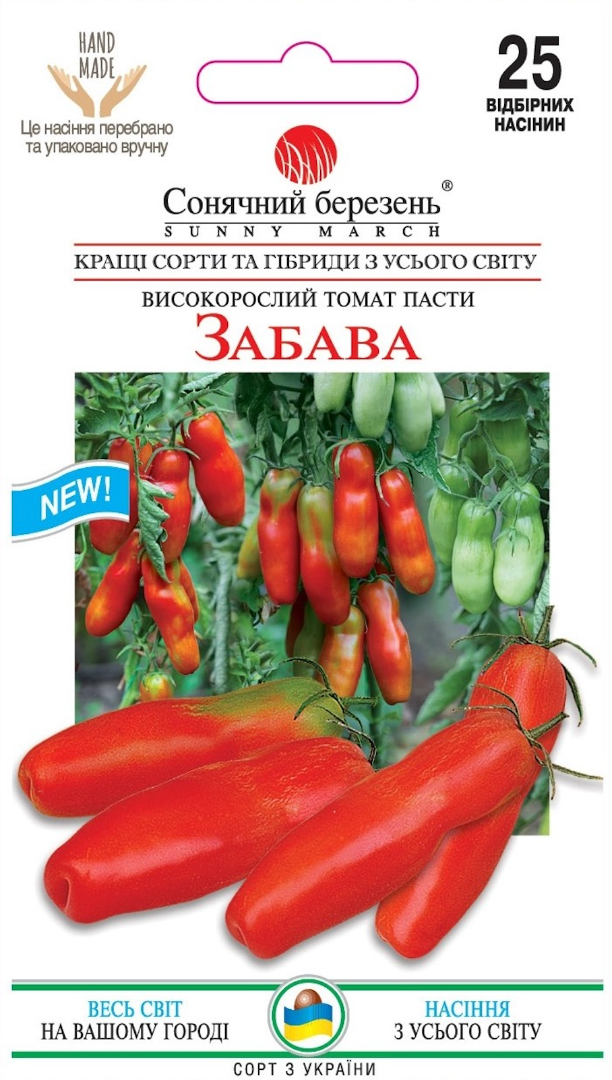 Забава - оригінальна форма, високі салатні та засолювальні якості! Новий середньоранній сорт томату. Період від повних сходів на початок дозрівання плодів 120 днів. Рослина індетермінантна. Кисть проста. У кисті утворюється 5-8 плодів високих салатних та засолювальних якостей. Плід яскраво-червоний, циліндричний, гладкий. Маса товарного плоду 100-230 г. вимагає систематичного внесення калійних добрив. Врожайність: 8 кг із куща. Щільність висадки 4 шт./кв.м.