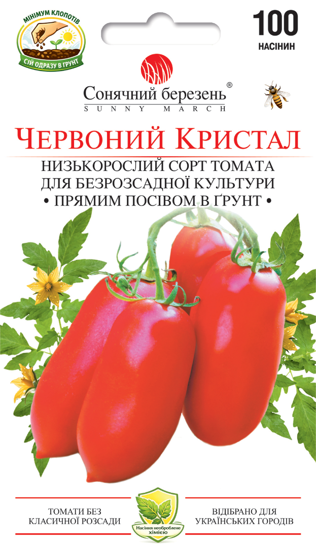 Ранньостиглий сорт, створений для стабільного врожаю та бездоганної якості плодів. Це томат, який поєднує акуратний кущ, красиву форму плодів і справжню практичність у використанні. Рослина детермінантна, напіврозкидна, заввишки до 70 см. Формує міцний, добре збалансований кущ, зручний у догляді та збиранні врожаю. Сорт рано вступає в плодоношення і дружно віддає продукцію. Плоди вирівняні, видовжено-овальної форми, типу великого «вершка». Томати інтенсивно-червоні, дуже щільні, з міцною шкіркою, що забезпечує високу транспортабельність і лежкість. Середня маса плодів 120 г, форма і розмір ідеальні для цільноплідної переробки. М’якоть щільна, м’ясиста, з насиченим томатним смаком. Завдяки універсальним якостям Червоний кристал однаково добре підходить для свіжого споживання, консервування та приготування паст і соусів. Сорт стабільний, практичний і вигідний у вирощуванні саме той томат, який однаково цінують і городники, і переробники.